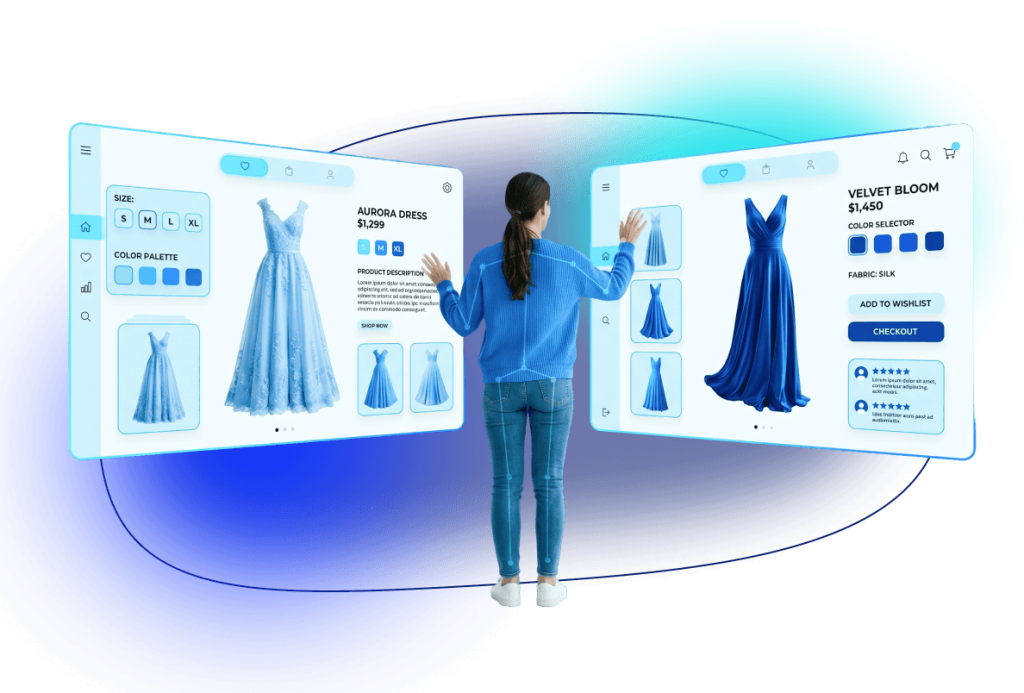 Genera un’anteprima fotorealistica del vestito sul tuo corpo, da ogni angolazione.